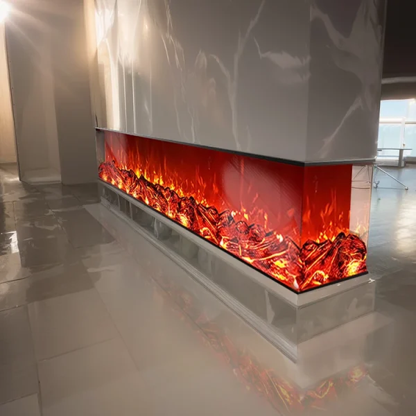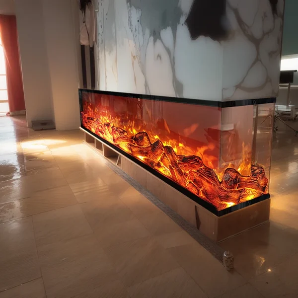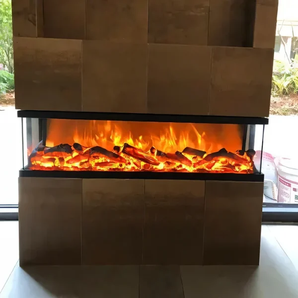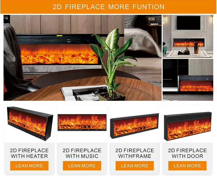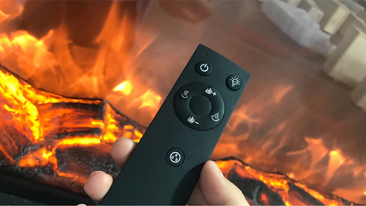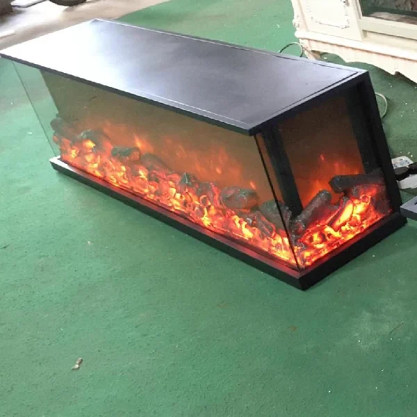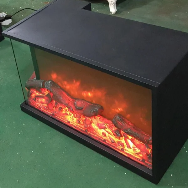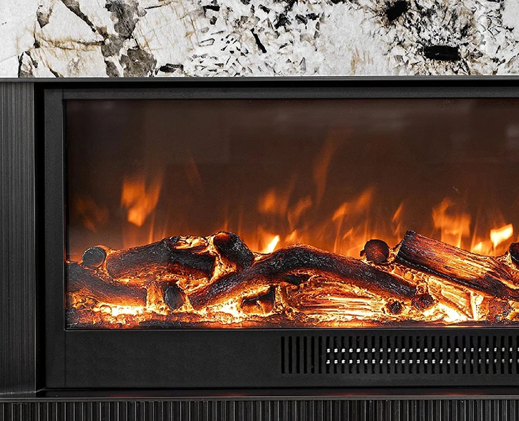 The surface of the flat fireplace is protected by glass, and the inside is a self-developed chiba reflective piece and LED lampwith high simulation resin charcoal.