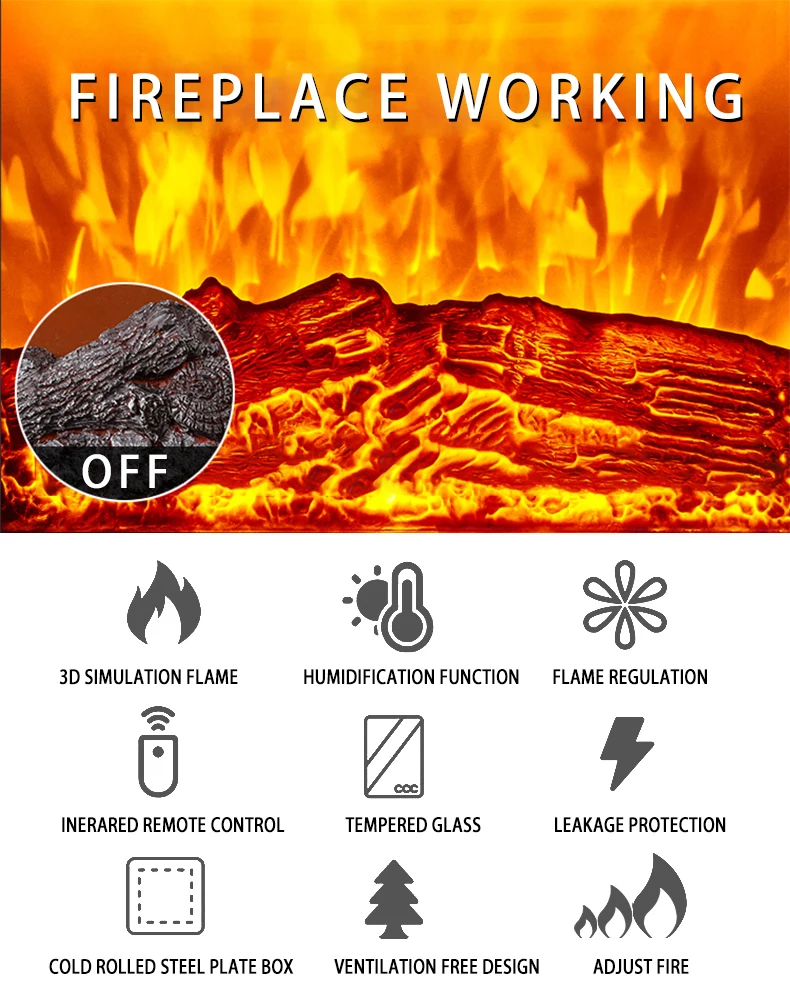 The 2D decorative fireplace has its own appearance of fireplace charcoal before starting up. After starting up, the charcoal and