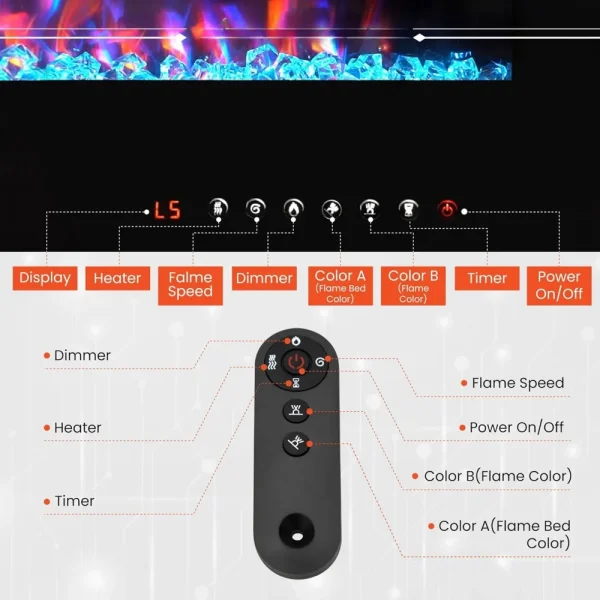 - 【Remote control & Touch screen】: Using remote to light up when pluggedUsing remote to light up when plugged.Remote and touch screen make it more convenient to control every function of the electric fireplace, power switch, temperature, independent switch of heating and flame, adjustable flame color and speed,1h-8h timer function