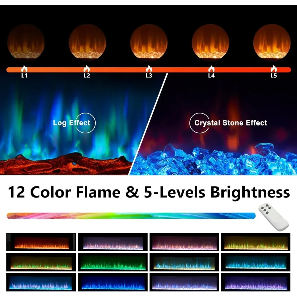 • High-tech Electric Fireplace: Our fireplace has realistic 3D flame effects and glowing logs. The warmth ambiance is provided but without dust, firewood or smoke. Users can enjoy twelve changeable led colors and five levels of flame brightness. Adjustable temperature settings from 62°F to 82°F. You can adjust timer from 1H to 8H