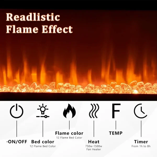• High-tech Electric Fireplace: Our fireplace has realistic 3D flame effects and glowing logs. The warmth ambiance is provided but without dust, firewood or smoke. Users can enjoy twelve changeable led colors and five levels of flame brightness. Adjustable temperature settings from 62°F to 82°F. You can adjust timer from 1H to 8H
