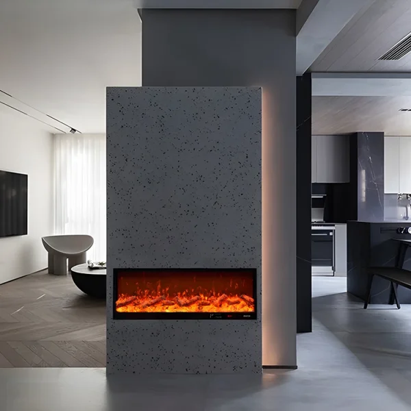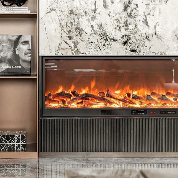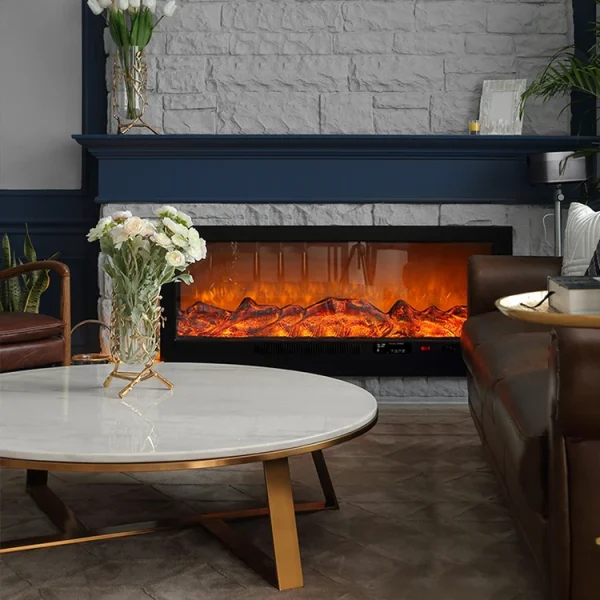 The surface of the flat fireplace is protected by glass, and the inside is a self-developed chiba reflective piece and LED lampwith high simulation resin charcoal.
