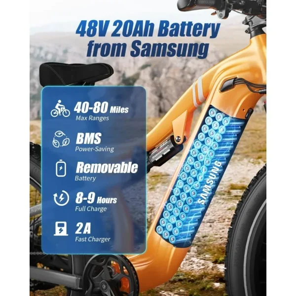 🔋𝟒𝟖𝐕 𝟐𝟎𝐀𝐇 𝐑𝐞𝐦𝐨𝐯𝐚𝐛𝐥𝐞 𝐁𝐚𝐭𝐭𝐞𝐫𝐲 & 𝟖𝟎𝐌𝐢𝐥𝐞𝐬 𝐌𝐚𝐱 𝐑𝐚𝐧𝐠𝐞: Hidden removable 48V 20Ah battery with Samsung cells to ensure using safety; 54V 2A charger for 6-8 hours of fast charging for up to 40-80 miles of range (NOTE: in pedal assist mode) The aileage range varies according to road condition, riding mode, weather, rider’s weight, battery power value etc.