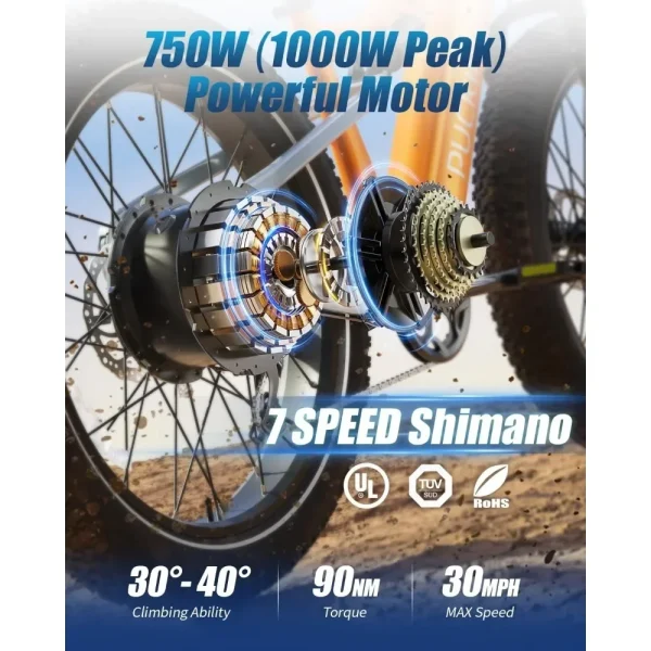 🚴𝟏𝟎𝟎𝟎𝐖 𝐏𝐞𝐚𝐤 𝐁𝐫𝐮𝐬𝐡𝐥𝐞𝐬𝐬 𝐌𝐨𝐭𝐨𝐫 & 𝟑𝟎𝐌𝐏𝐇 𝐓𝐨𝐩 𝐒𝐩𝐞𝐞𝐝: electric bike adopts 750W high-speed brushless rear hub motor (Peak 1000W). 90Nm of torque offers strong climbing power (40° Max climbing ability) . Top speed up to 30MPH in pedal assist mode, 20MPH in pure electric throttle mode. PUCKIPUPPY electric bikes had passed stringent UL 2849 testing (Testing lab name: UL LLC).