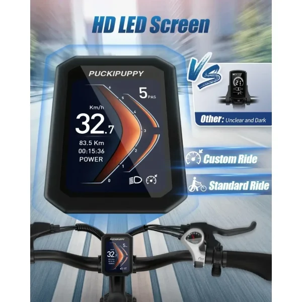 🚴𝟓 𝐑𝐢𝐝𝐢𝐧𝐠 𝐌𝐨𝐝𝐞𝐬 & 𝐄𝐱𝐜𝐞𝐥𝐥𝐞𝐧𝐭 𝐃𝐞𝐭𝐚𝐢𝐥: ①Electric Mode ②Pedal-assist Mode ③Cruise Mode ④Manual Mode ⑤Walk Mode. Feel free to switch your riding mode according to your needs or mood. PUCKIPUPPY made of light weight frame and high quality aluminum 6061 alloy, more sturdy and durable. Equipped with Shimano 7 speed transmission, precise and stable; 26″x 4″ fat tires bring more comfortable experience; Upgraded LCD intelligent displayprovides clear and powerful data support.