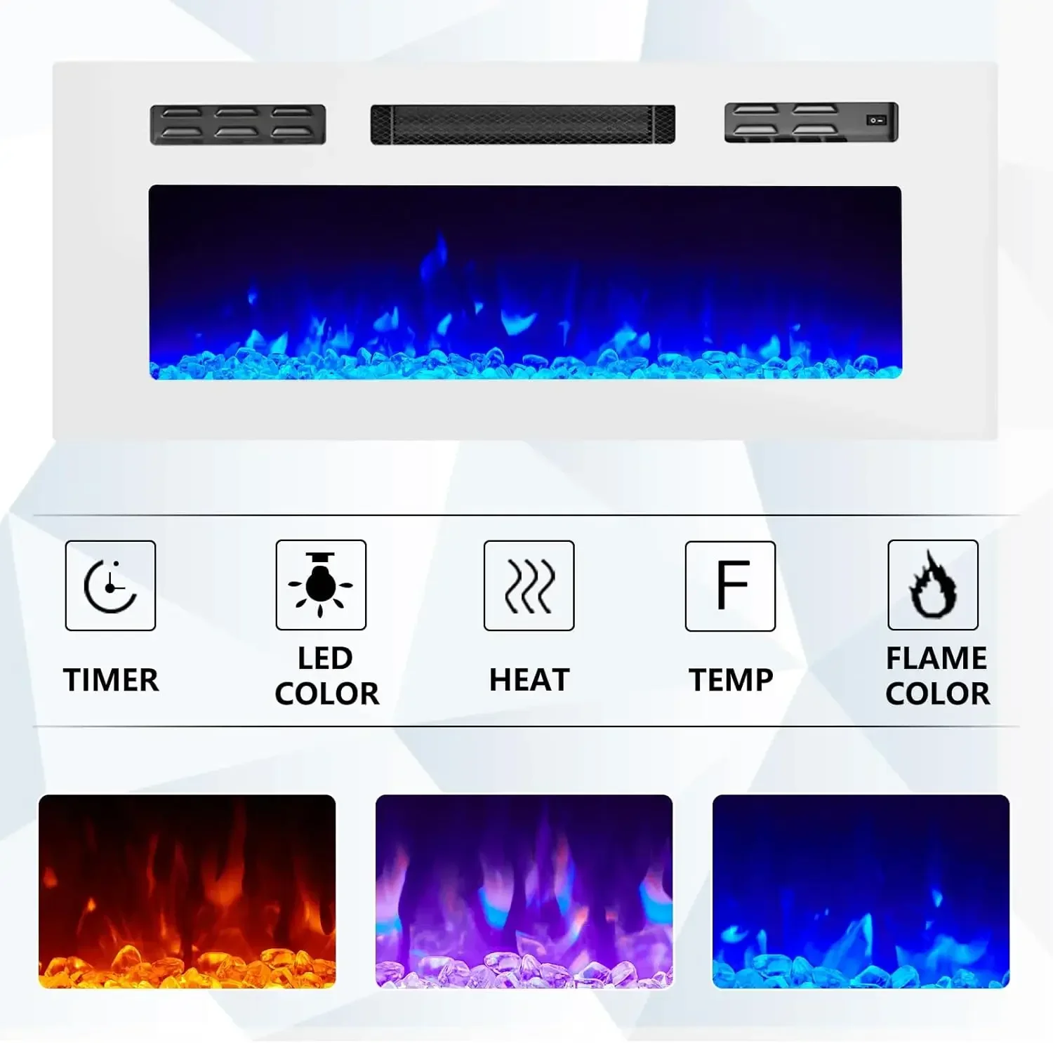 - 【Multifunctional Fireplace】Provide 3 changeable realistic flame colors & 5 levels of dimmer, temperature control, and timer setting (By remote or button). Max 4,800 Btu powerful output heat a room up to 400 sq. ft.