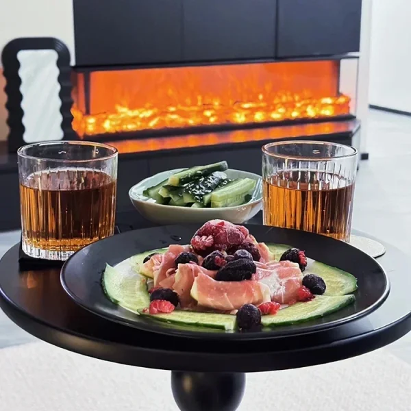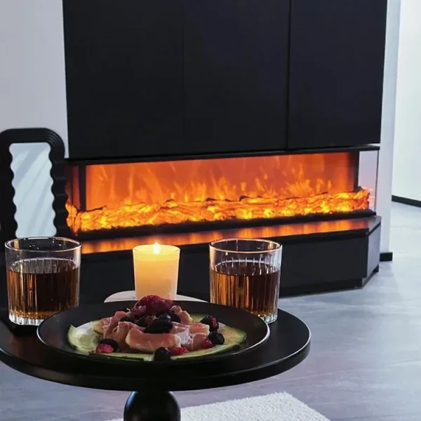 The surface of the flat fireplace is protected by glass, and the inside is a self-developed chiba reflective piece and LED lampwith high simulation resin charcoal.