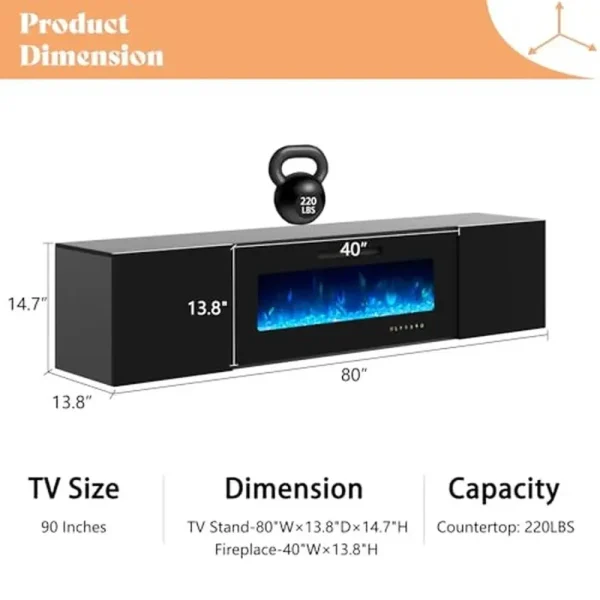 Dimensions & Load Capacity: Entertainment Center-80″W×13. 8″D×14. 7″ H, Fireplace-40″ W×9. 8″ H. Maximum load capacity is 200LBS. Large floating fireplace TV cabinet has undergone safety testing, so you can use it with confidence.
