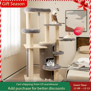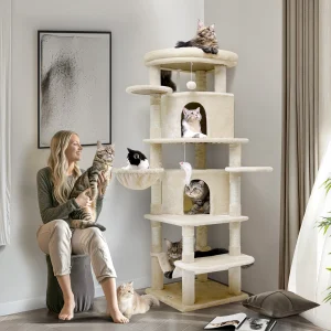 C66 Large Cat Tower, Curved Series Corner Cat Trees and Towers for Large Indoor Cats with Big Cat Condos, 6 Scratching Posts