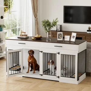 Dog Crate Furniture, 72.05 Inch Wooden Large Dogs Kennel with 2 Drawers & Dogs Bowls, Dog Cage with Double Doorss & Divider